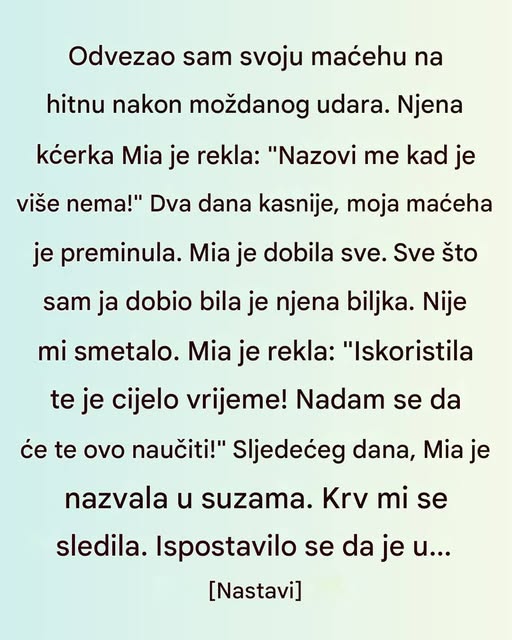 Kada je došlo vrijeme čitanja testamenta, Mija se pojavila u crnoj dizajnerskoj haljini, bez suza i sa hladnim izrazom lica. U tom trenutku, jasno je bilo da su emocije na drugoj strani. Sve što je moja pomajka stekla tokom života — ušteđevina, stan, nakit i drugi vrijedni predmeti — pripalo je njoj. Meni je ostala samo jedna stvar: stara biljka koja je godinama stajala u našem dnevnom boravku. Biljka koju sam s ljubavlju zalivala, orezivala i s kojom sam razgovarala tokom usamljenih noći. Bio je to jedini predmet koji me podsjećao na našu vezu, a nije imao nikakvu materijalnu vrijednost. Iako sam osjećala povrijeđenost zbog nepravde koja mi je učinjena, znala sam da materijalne stvari ne mogu nadomjestiti emocije i sjećanja koja smo dijelile.