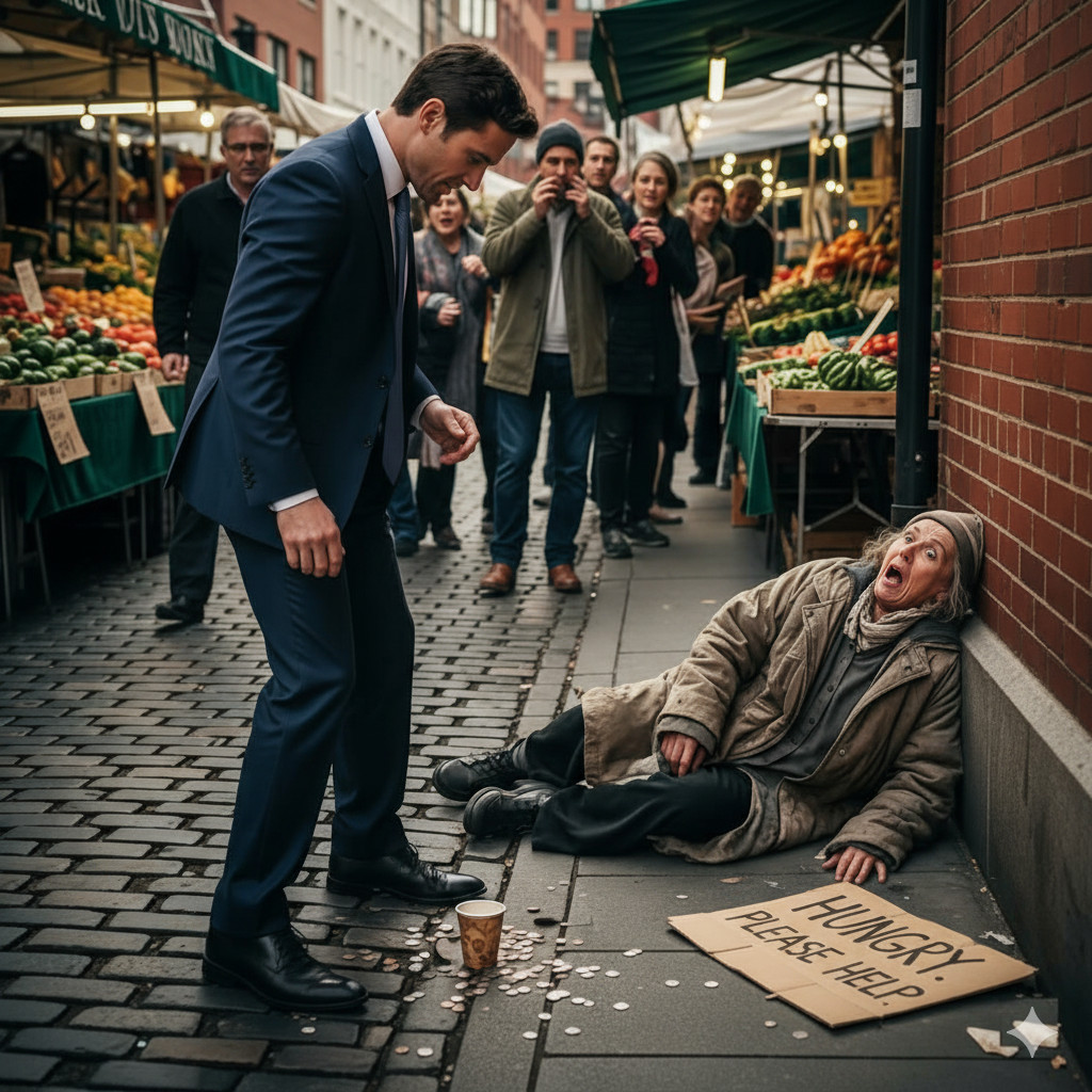 Međutim, unutar te slike luksuza i bogatstva, Adrian je nosio teret prošlosti koji je bio daleko od izgubljenog. Na kraju pijace, u sjeni tezgi s povrćem, starija žena sjedila je s natpisom u rukama: „Gladan sam. Pomozite.“ Njene drhtave ruke su se borile da zadrže praznu čašu, dok su prolaznici, prilikom prolaska, okretali glavu s tugom u očima. Ova scena, koja je bila u suprotnosti s njegovim životom, probudila je u Adrianovim mislima osjećaje koje je dugo potiskivao. Iako ju je primijetio, Adrian je odlučio ignorirati njenu patnju, preplavljen vlastitim mislima i brigama, sve dok sudbina nije učinila svoje.