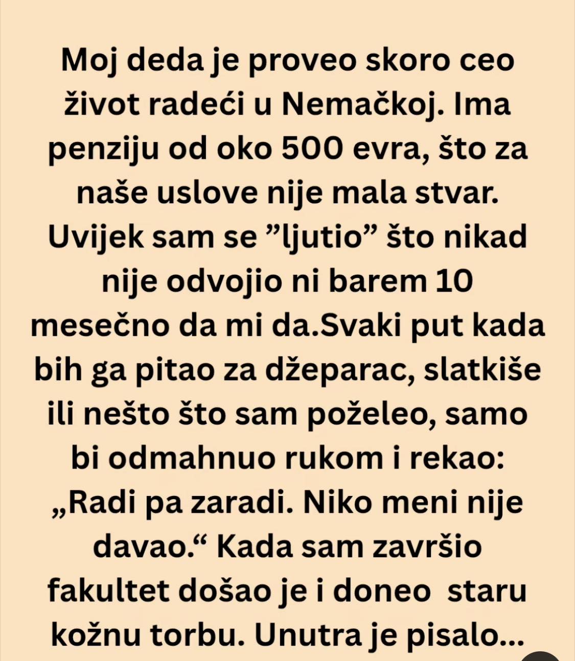 Kada je prišao, pružio mi je torbu bez mnogo reči, ostavljajući me zbunjenim. Na torbi je pisalo samo jedno: „Da kupiš sebi posao.“ Otvorio sam je i ostao bez daha. Unutra je bilo tačno 10.000 evra, pažljivo složenih u malim svežnjevima. U tom trenutku nisam znao šta da kažem, sve što sam osećao bilo je iznenađenje i zbunjenost, ali i sumnja u to kako je došlo do ove sume. Iako sam znao da je deda štedio, nisam mogao da pojmim da je taj iznos bio rezultat godina i godina strpljenja i discipline.