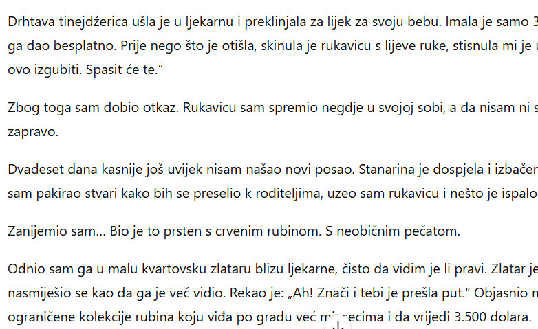 Znači i tebi je prešla put.” U tom trenutku, zlatar mu je otkrio da je prsten dio ograničene kolekcije rubina koja se viđa po gradu već mjesecima, te da njegova vrijednost iznosi nevjerovatnih 3.500 dolara.