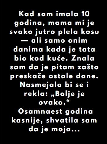 Ovakve uspomene nas podsećaju koliko su male stvari važne i kako one oblikuju naš život. Možda danas pletenje kose nije deo tvoje rutine, ali sigurno postoje neki drugi trenuci koje deliš sa svojim najmilijima, i koji ostaju trajno utkani u tvoje srce. Upravo ti trenuci grade osnovu za toplinu i sigurnost koja nas prati kroz ceo život.