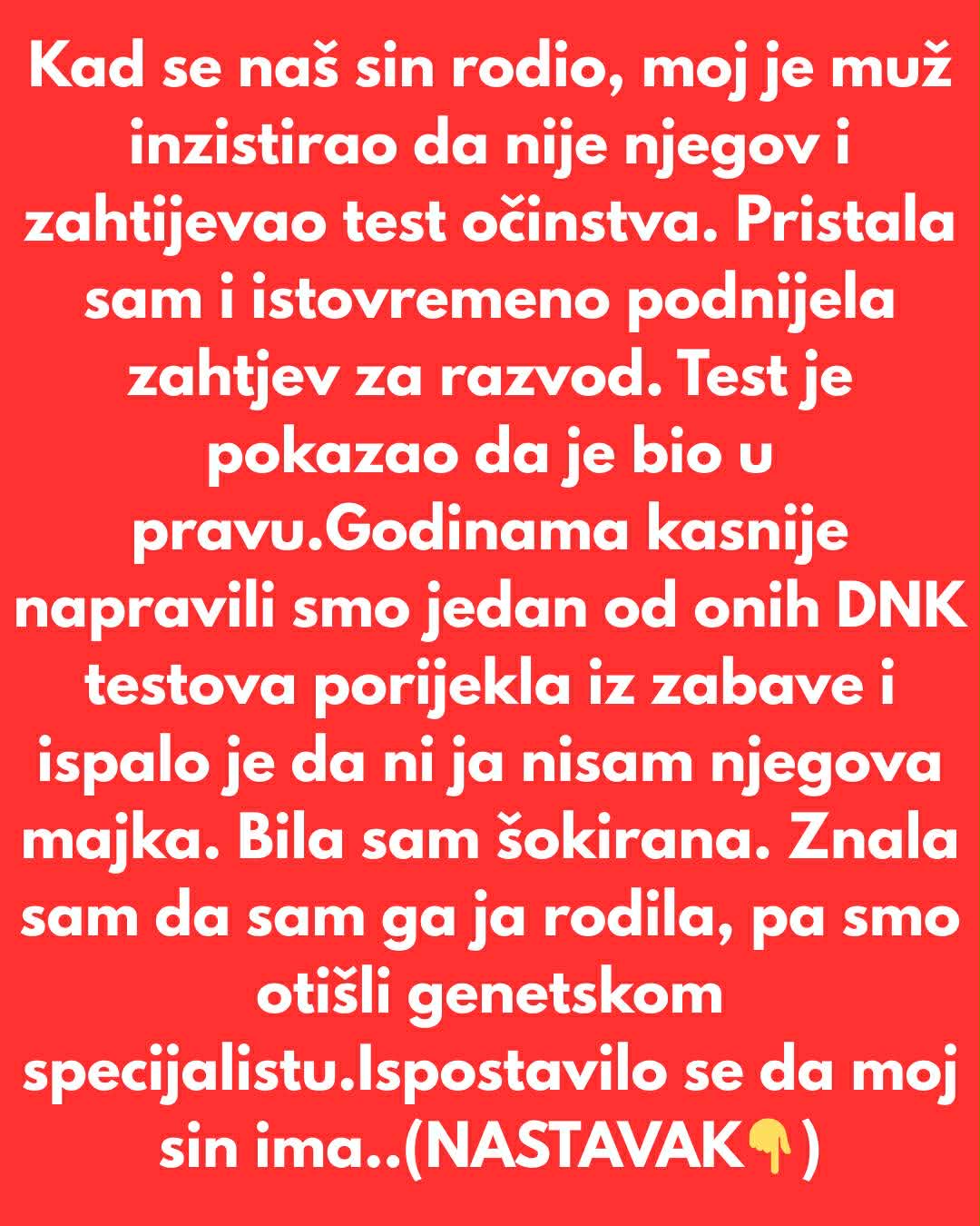 Naime, otac je, od trenutka kada je njegov sin došao na svet, bio uveren da to nije njegovo dete. Ova sumnja ga je navela da zahteva testove očinstva kako bi razjasnio situaciju. Njegova supruga, iako pogođena njegovim sumnjama, pristala je na testiranje koje je ubrzo dovelo do brze i emotivne odluke o razvodu. Na njihovu sreću, ili možda nesreću, rezultati su potvrdili njegovu sumnju – dijete nije bilo njegovo. Međutim, to nije bio kraj njihove priče. Godinama kasnije, iz znatiželje i želje za saznanjem više o svom poreklu, odlučili su se na DNK test koji je otkrio šokantnu istinu – ni ona nije bila njegova biološka majka. Ovo otkriće otvorilo je vrata nepoznatog i prisililo ih da potraže stručnu pomoć.