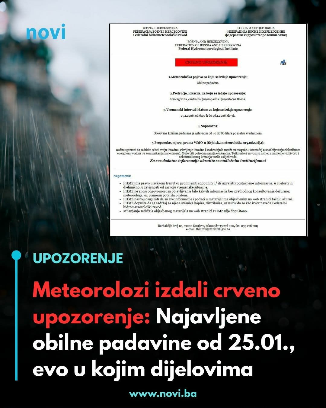 Uoči predstojećih vremenskih prilika, meteorolozi iznose važne informacije o obilnim padavinama koje će od 25. januara početi zahvatati različite regije Bosne i Hercegovine. Ova pojava će najviše pogoditi Hercegovinu, centralnu Bosnu, kao i jugozapadni i jugoistočni dio zemlje. Prema trenutnim prognozama, upozorenje će ostati na snazi do 26. januara u ranim jutarnjim satima, što može izazvati ozbiljne posljedice za građane i infrastrukturu. Ovakvi vremenski uslovi nisu neobični za ovo doba godine, ali su značajni zbog svoje intenzivnosti.
