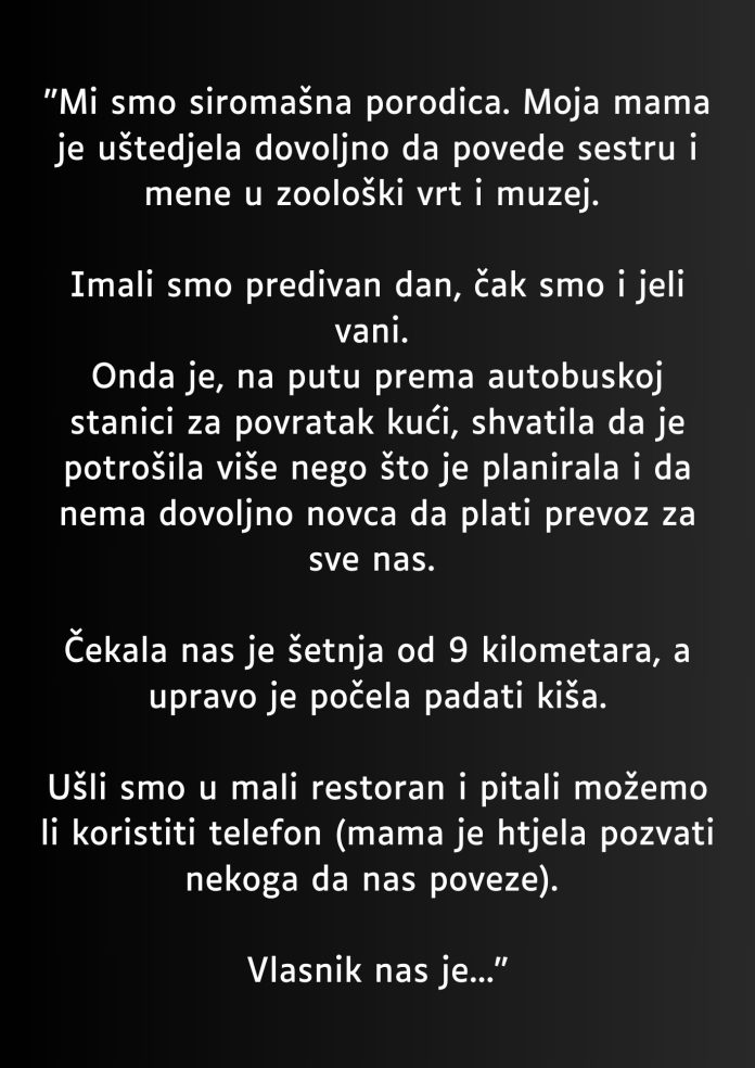 Iako situacija nije bila idealna, mama je ostala smirena. Znala je da moramo pronaći rješenje, jer strah nije donio nikakvu korist. Odlučila je da uđemo u obližnji restoran i zamolimo za pomoć. Trebali smo telefon da pozovemo nekoga ko bi nas mogao odvesti kući. Bilo je to hrabro i odlučno, s obzirom na to da smo se nalazili u teškoj situaciji, ali nismo imali mnogo opcija. Taj trenutak nas je naučio koliko su važne odlučne akcije, čak i kada nam se čini da je sve izgubljeno.