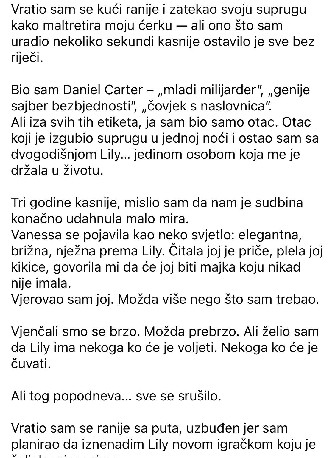 Međutim, sudbina je imala druge planove. Jednog popodneva, Daniel se iznenada vratio ranije sa službenog puta, uzbuđen da iznenadi Lily. Kada je ušao u kuću, tišina ga je zapanila. Nedostajali su smeh i igra, a srce mu je brže zakucalo. Iako je očekivao da će zateći svoju kćerku kako se zabavlja, umesto toga, našao je mirnu i napetu scenu u dečijoj sobi. U tom trenutku, sve se promenilo. Ovaj nepredviđeni povratak otkrio je tamnu stranu Vanesse, koja je do tada izgledala kao savršena zamjena za Lilyinu majku.