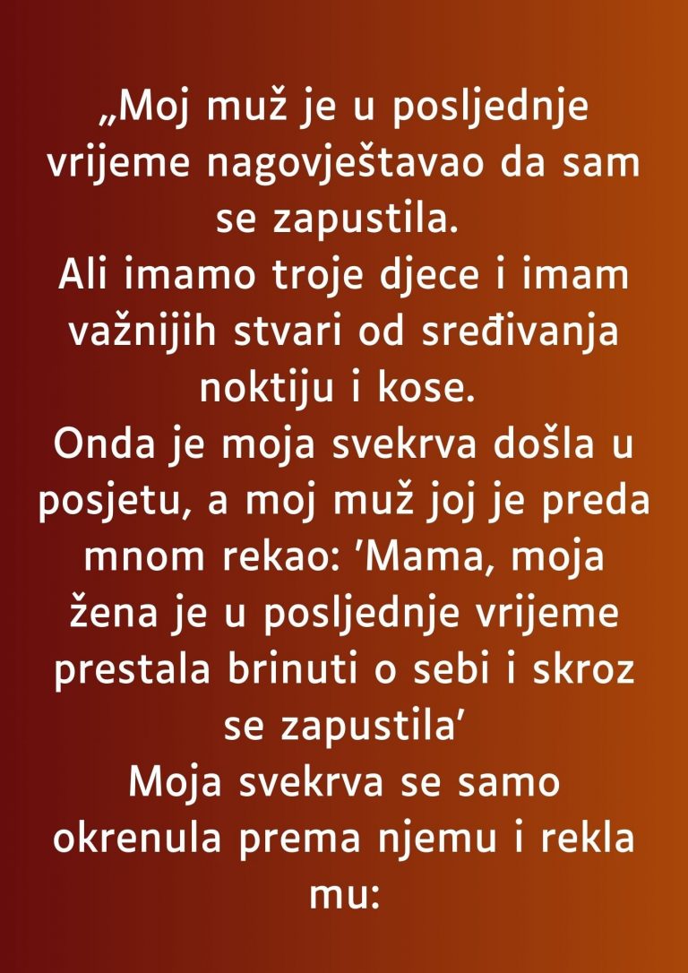 Žena o kojoj se radi primila je oštre kritike od svog muža, koji je otvoreno izrazio nezadovoljstvo njenim izgledom i svakodnevnim ponašanjem. Naime, on je svojoj majci rekao: “Mama, moja žena je prestala brinuti o sebi i potpuno se zapustila.” Ove reči, umesto da budu motivacija za promjenu, izazvale su u njoj osjećaj bezvrednosti i dubok nezadovoljstva. Umesto da je muž podrži, njegove riječi su dodatno pojačale njen osjećaj nesigurnosti, stvarajući duboku emocionalnu ranu koja je teško zacjeljivala. Ovaj oblik kritike često dovodi do smanjenja samopouzdanja kod partnera, što može rezultirati ozbiljnim posljedicama po njihov odnos.