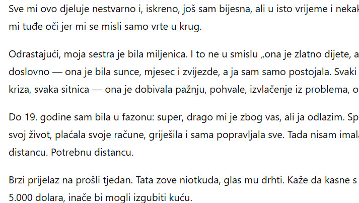Zašto je ona bila ta koja treba preuzeti odgovornost za porodične dugove? Ova situacija je poslužila kao okidač za daljnje preispitivanje odnosa s roditeljima i sestrama, ali i za razmatranje vlastitih granica i očekivanja.