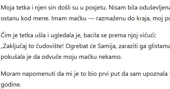 Tetka je bila u pravu da se osjećala nelagodno, ali nisam mogla ni zamisliti život bez mog ljubimca. Odluka je bila teška, ali sam odlučila da će moja mačka ostati slobodna. Objasnila sam tetki da je ona dio mog života i da je važno da je prihvati.