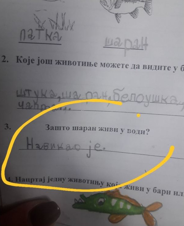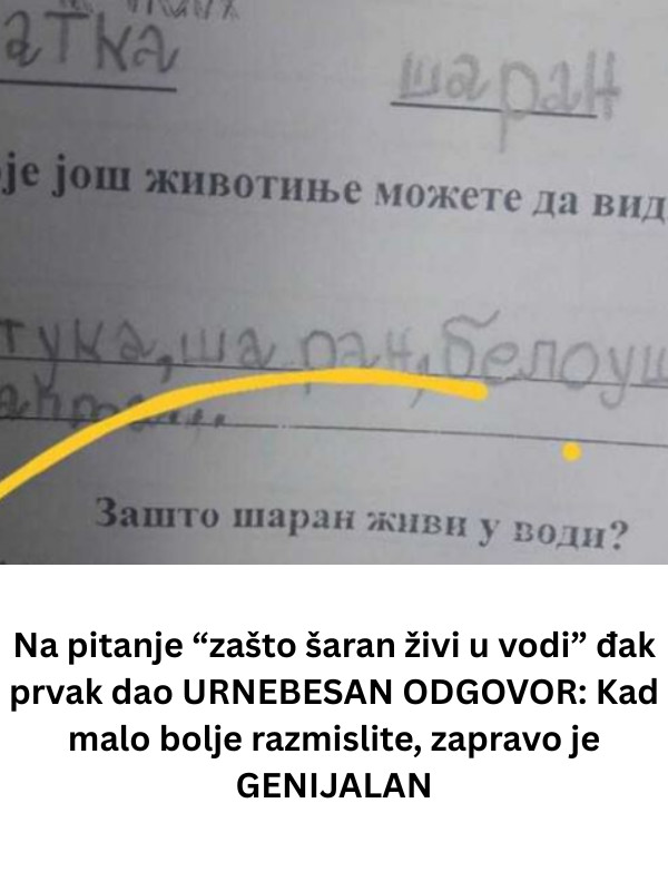 U jednom beogradskom razredu osnovne škole, dogodila se scena koja nije samo nasmijala prisutne, već je i otvorila vrata razmišljanju o nevjerojatnoj iskrenosti i logici koju djeca posjeduju. Naime, tokom testa iz predmeta “Svijet oko nas”, učitelj je postavio jednostavno pitanje: “Zašto šaran živi u vodi?” Očekivano, učenici su se trudili da ponude odgovore bazirane na naučnim činjenicama, poput “Zato što je njegovo tijelo prilagođeno životu u vodi.” Međutim, jedan mali učenik je iznenadio sve prisutne kada je rekao: “Upoznat je s tim.”