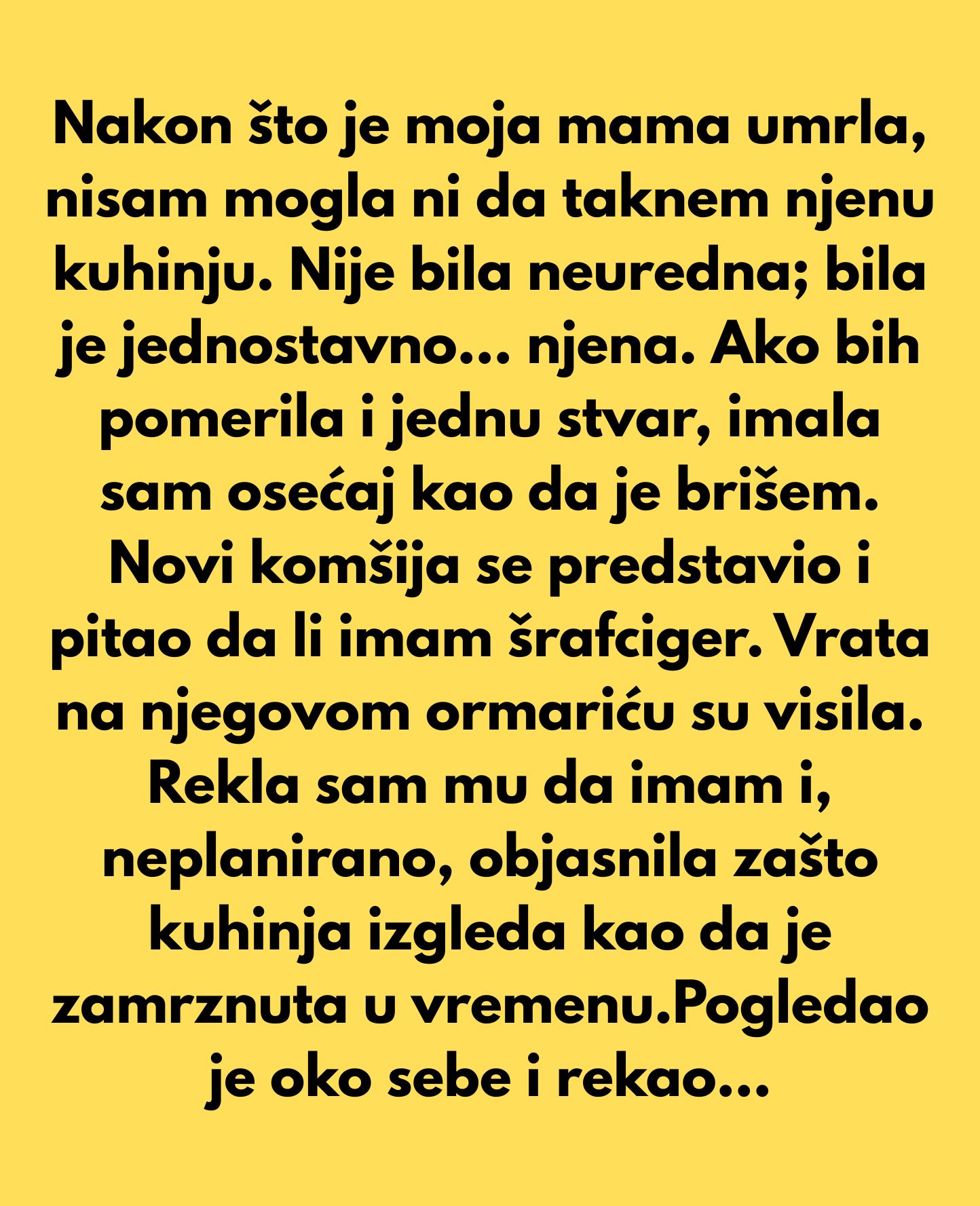 Jednog dana, novi komšija se preselio u zgradu i došao je da se predstavi. Sa osmijehom je pitao da li imam šrafciger, jer su vrata na njegovom ormariću visila. U tom trenutku, nisam mogla da se suzdržim, pa sam mu ispričala kako je moja mama voljela da kuha i kako je ta kuhinja postala svetište njenih uspomena. Ovaj razgovor s njim bio je osvježavajući, jer me podstakao da razmišljam o tome kako dijeljenje tih sjećanja može pomoći u procesu ozdravljenja. Njegova pažnja i iskreno interesovanje za moju priču otvorili su vrata mog srca, obnavljajući osjećaj povezanosti koji sam smatrala izgubljenim.