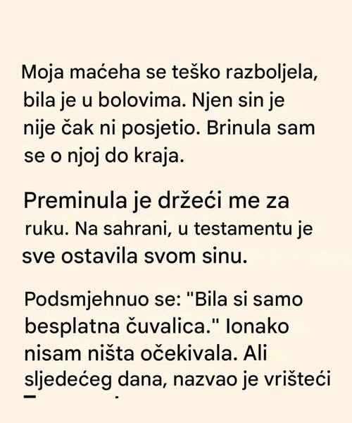 To pismo je nosilo poruku zahvalnosti. U njemu je ona istaknula kako je bila zahvalna što sam joj pružio podršku u trenucima kada je bila najslabija. Njen ton je bio pun topline i razumijevanja. Pisala je o tome kako je, iako nije mogla promijeniti svoj testament, željela da zna da je moja prisutnost značila više od bilo čega materijalnog. Ove reči su rekle mnogo više od formalnog nasljedstva. Njena poruka je odražavala duboku emocionalnu vezu koju smo razvili tokom godina, čak i kada su riječi često izostajale.