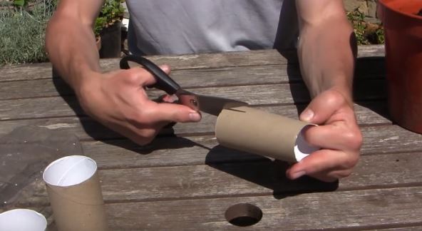 Korak 1 — Priprema rolnica: Na jednom kraju svake rolnice napravite četiri kratka reza (oko 2 cm). Preklopite krajeve prema unutra kako biste formirali dno. Ovaj korak je ključan jer će dno rolnice zadržati zemlju dok biljka raste.