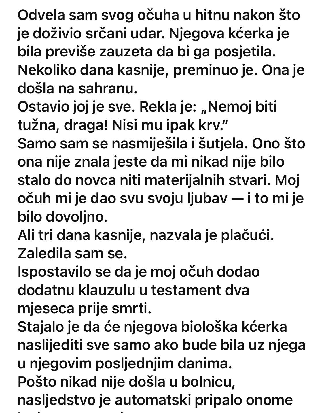 Kada sam stigla u bolnicu, osjećala sam se preplavljeno tugom i brigom. Moj očuh, koji je uvijek bio tu za mene, sada je bio ranjiv i u teškoj situaciji. Njegova kćerka, koja je trebala pružiti podršku, nije bila prisutna u njegovim posljednjim trenucima. Umjesto toga, bila sam ja, onaj ko je stajao uz njega, držeći ga za ruku dok je odlazio. Bilo je to emotivno iskustvo, prožeto sjećanjima na sve lijepe trenutke koje smo proveli zajedno — njegove nasmijane oči, mudre savjete i bezgraničnu podršku koju je pružao. Nekoliko dana kasnije, nažalost, preminuo je. Njegova kćerka je došla na sahranu, ali nije bila tu da mu kaže posljednje zbogom. Ovaj trenutak me natjerao na razmišljanje o tome koliko su često porodični odnosi kompleksni i kako se često zanemaruju oni koji su najvažniji.