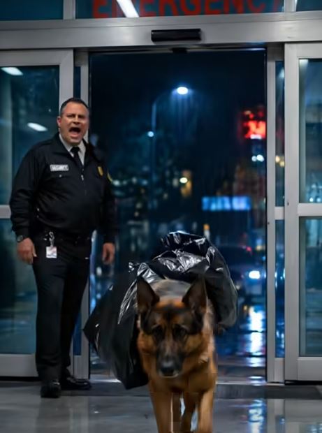 Iznenada, tišina je prekinuta snažnim lavežom. Osoblje se zbunilo, pokušavajući shvatiti odakle dolazi zvuk. Tada su se automatska vrata otvorila, a u bolnicu je ušao veliki njemački ovčar, mokar do kože, s crnom kesom pričvršćenom za leđa. Njegov izgled izazvao je šok među osobljem, a posebno kod zaštitara koji je pokušavao da ga zaustavi. Međutim, pas kao da nije obraćao pažnju na bilo šta osim na svoj cilj – recepciju.