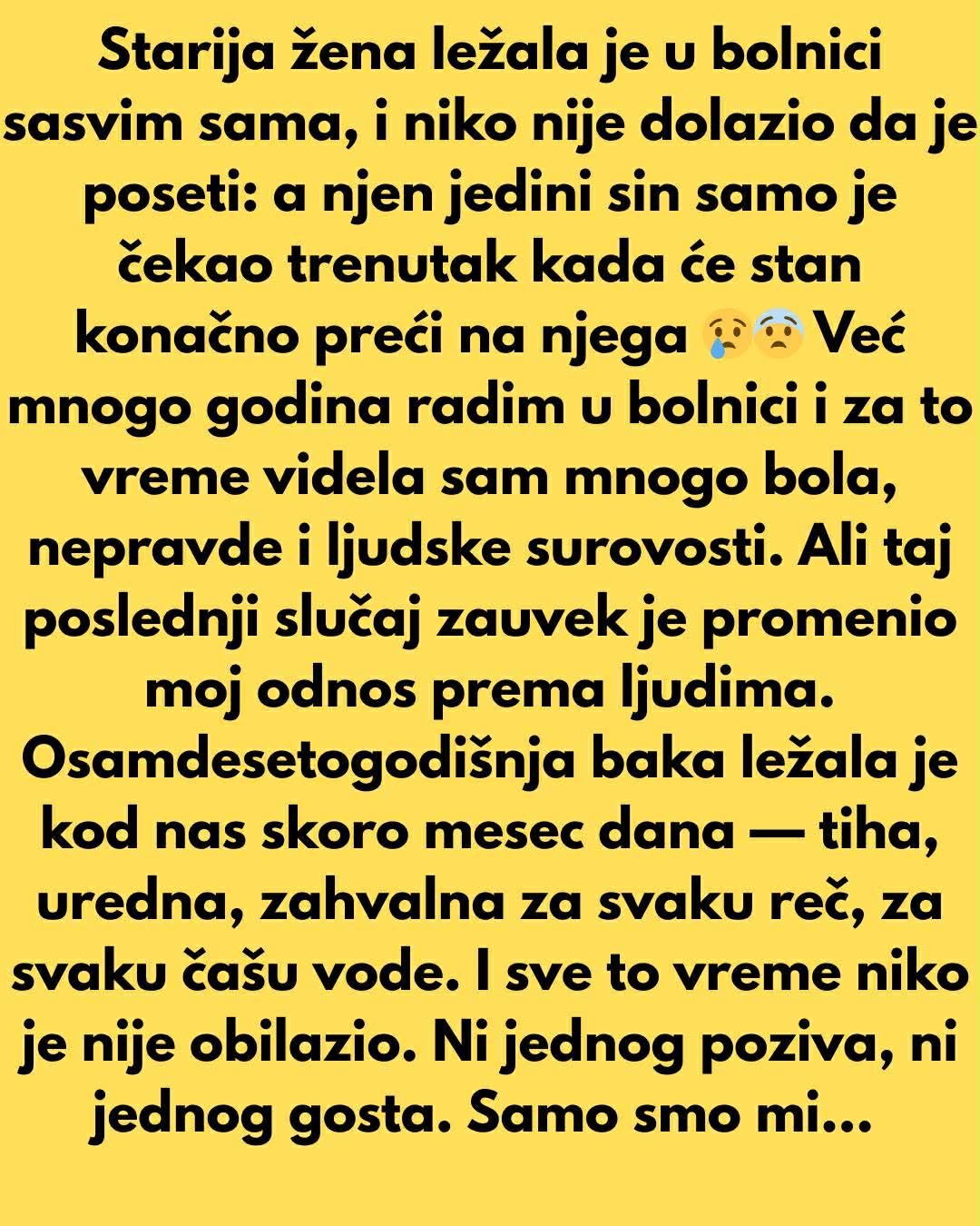 Vremenom, saznali smo da ima sina i snaju. Kada god bi ih pomenula, njen glas bi postajao tihi šaput, ne ispunjen ogorčenjem, već umorom. Sin se povremeno javljala, ali svaki put s istim hladnim pitanjem: “Da li je još uvek živa?” Njega su zanimali samo pravni aspekti, a ne njen emocionalni ili fizički bol. Njeno srce je bilo ispunjeno tugom, dok su dani prolazili bez ikakvih poseta. Svake večeri, očekivala je korake, nadajući se da će se njen sin napokon pojaviti, ali umesto toga, dolazila je samo tišina.Jedne noći, njeno zdravstveno stanje se naglo pogoršalo. Bili smo uz nju, pratili svaki njen uzdah dok su se njene oči borile s nevidljivim demonima. U tom trenutku, skupila je snagu i izgovorila svoje poslednje reči koje su nosile težinu svih neizgovorenih misli: “A sin još nije došao.” Njene reči odjeknule su u sobi poput udarca groma. To je bila završna tačka njenog čekanja, trenutak kada je srce stalo. Ovaj dramatičan trenutak ostavio je snažan utisak na sve nas u bolnici, podsećajući nas na krhkost ljudskog života i važnost međuljudskih odnosa.