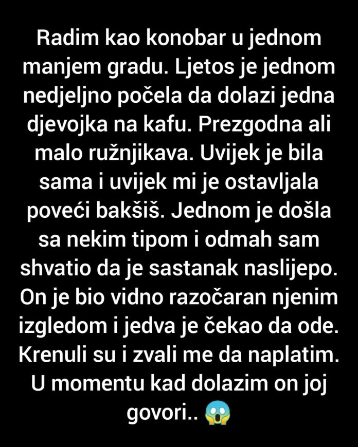 Konobar, koji je svakodnevno radio u lokalnom kafiću, poznavao je svoje goste bolje nego većina. Među njima se izdvajala jedna djevojka koja je redovno dolazila po svoju omiljenu kafu. Njen osmijeh i vedrina bili su neizostavni dio atmosfere kafića. Svi su je smatrali lijepom, ali njen izgled izazivao je različite reakcije. Dok su neki vidjeli samo njenu privlačnost, drugi su je skretali na stranu, oslikavajući je kao “malo ružnjikavu”. Unatoč tome, ona nije dopustila da je to obeshrabri. Uvijek je bila nasmijana, ljubazna i ostavljala izdašan bakšiš, pokazujući da njena unutrašnja ljepota nadilazi predrasude. Ova djevojka nije bila samo lice koje se pojavljuje u kafiću; ona je bila simbol snage i otpornosti.