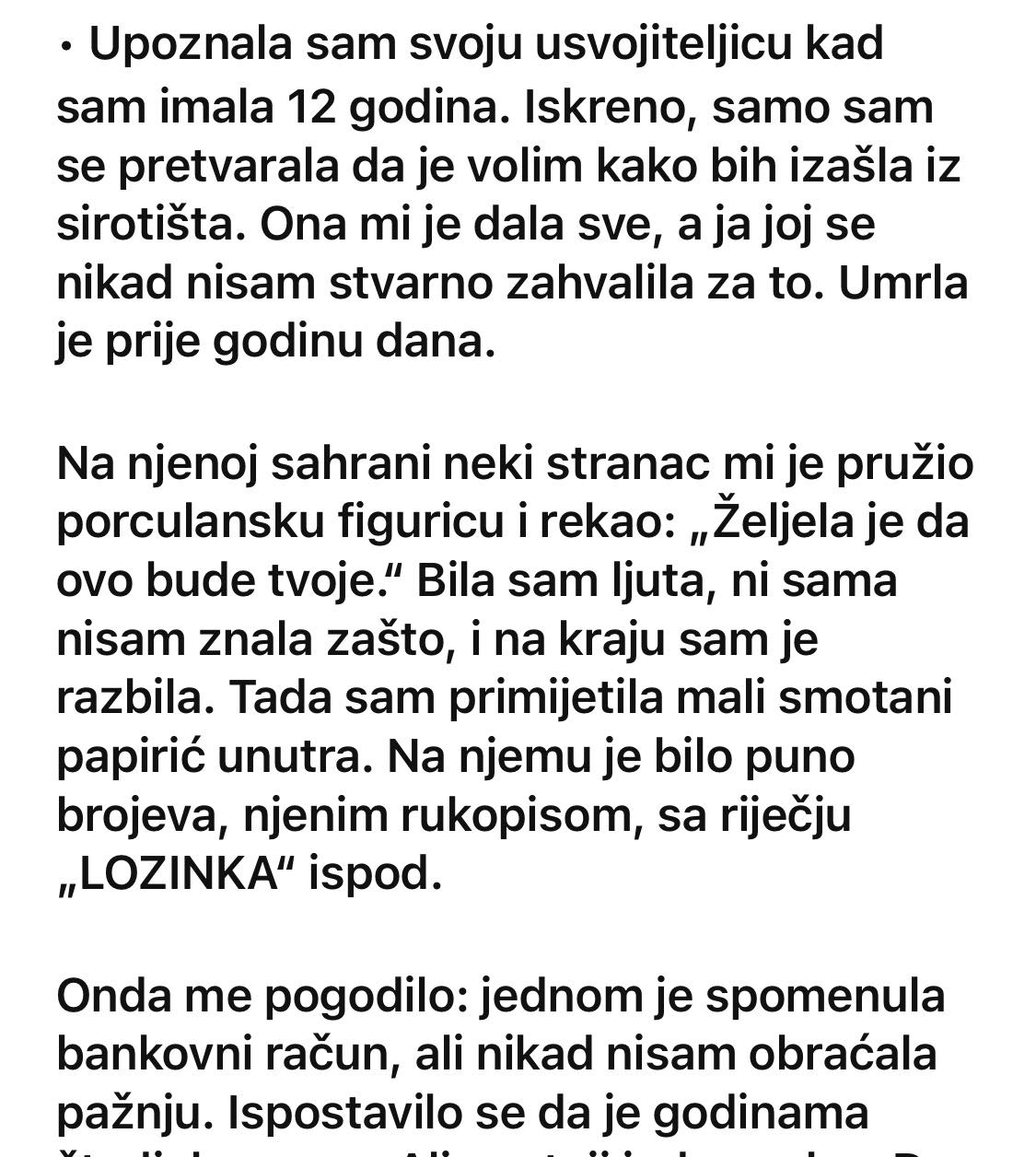 Na njemu je bio niz brojeva i riječ „LOZINKA“ ispod. Dok sam čitala njen rukopis, sve je počelo dobijati smisao. Taj komadić papira postao je simbol ne samo njenog naslijeđa, već i njenog neodustajanja da me motivira čak i nakon smrti.